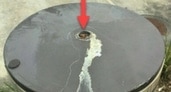 Cheap, illegal plumbing repaired by Whywait Plumbing after sewer odours were escaping inside an office because there was a 35mm gap allowing the odours to escape where a 65mm pipe had been pushed inside a 100mm pipe