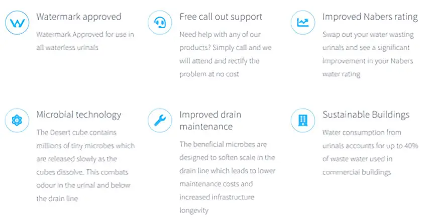 This is a complete lie. The Desert cartridge does not hold WaterMark certification for any of the brands it lists, and no independent urinal manufacturer endorses it for use in their systems. This claim misleads buyers into believing it is legally compliant when it is not.